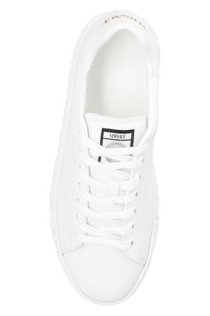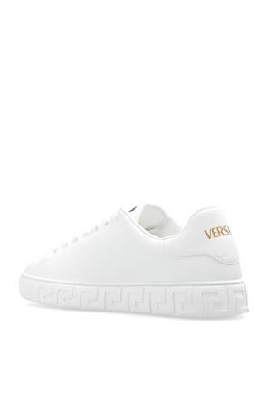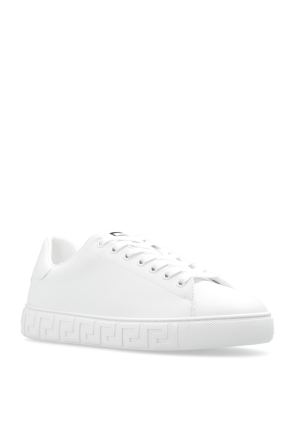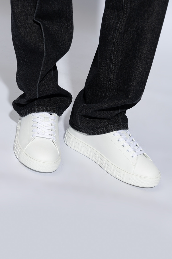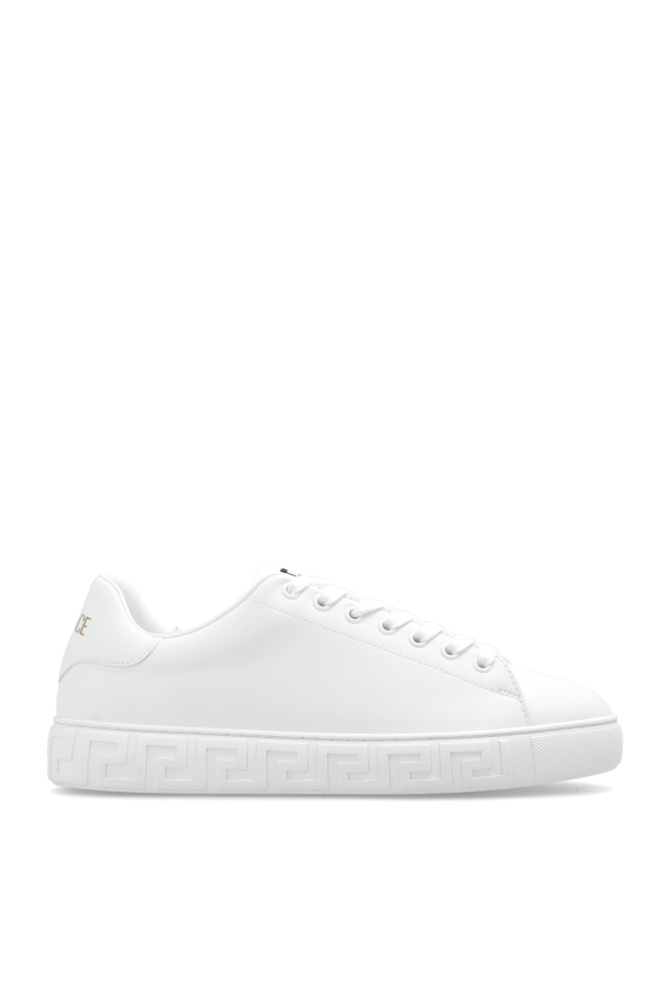 Versace的白色Greca运动鞋,系带设计。采用仿皮革材质制成。饰有标志贴花和标志印花。白色橡胶外底,饰有凸起的Greca图案。