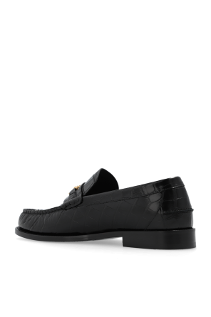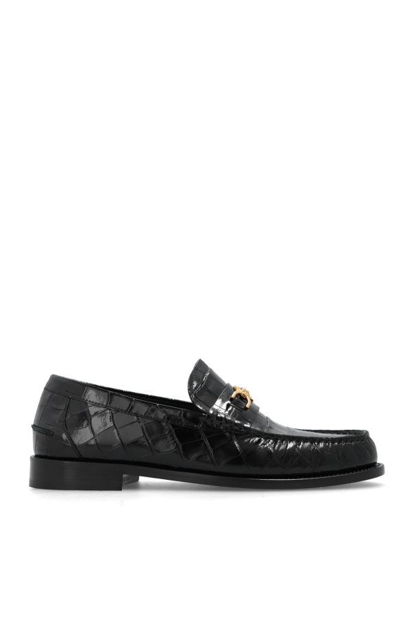 Black loafers from Versace. Made from leather with a crocodile skin effect, this model sits on a black leather sole and showcases gold-tone hardware with the brand's signature Greca and Medusa face motifs.