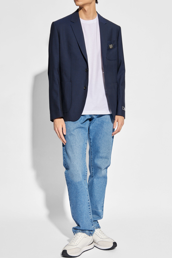 Versace的深蓝色羊毛西装外套,平驳领,纽扣开合。饰有银色的Medusa标志贴花。正面设有三个口袋。长袖。后背有单开衩。