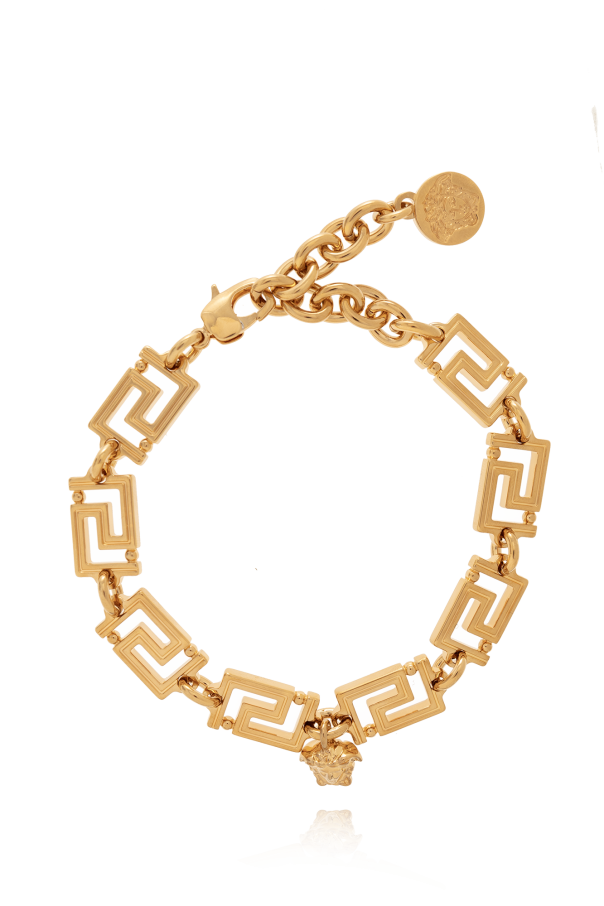 Gold-tone bracelet from Versace. This item adjusts via a lobster clasp and showcases the brand's Greca motif and a signature Medusa face pendant.