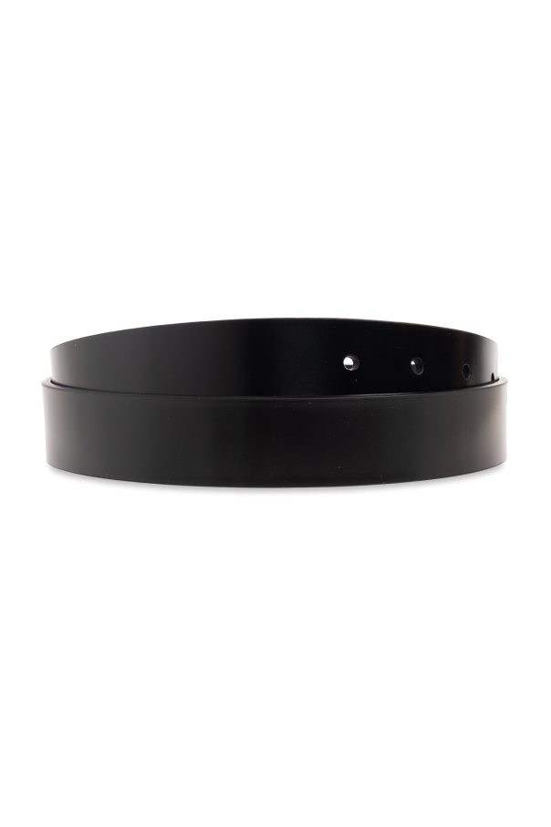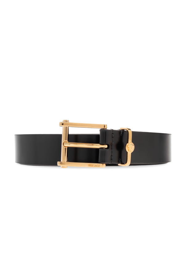 Versace的黑色皮带。采用光滑皮革制成。金色扣环饰有特色的美杜莎头像和刻有品牌标志。