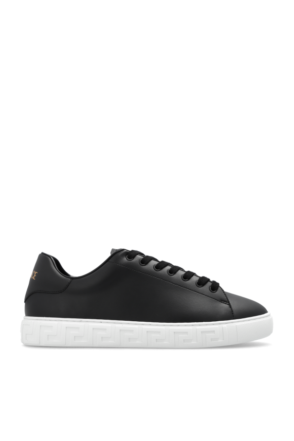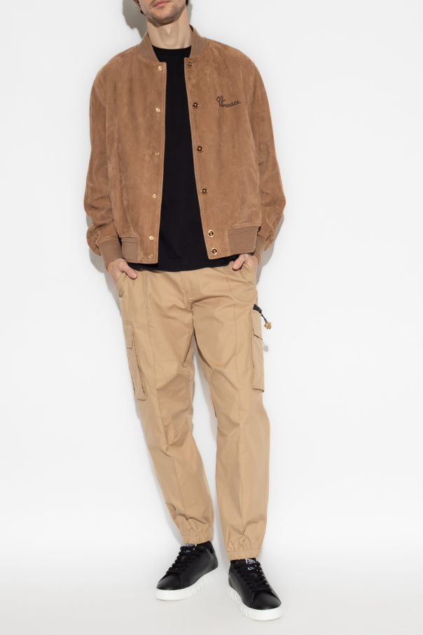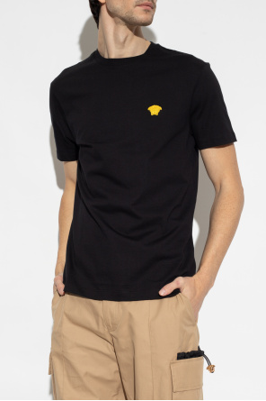 Versace的黑色T恤。采用棉质面料制成。正面饰有黄色刺绣的梅杜莎头图案。松紧圆领,短袖。