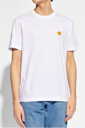 White crewneck T-shirt from Versace. Made from cotton, this style features short sleeves and a signature Medusa face patch on the front.