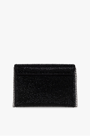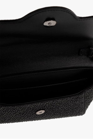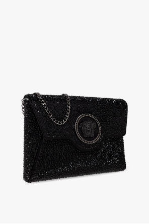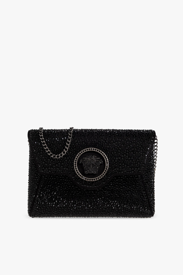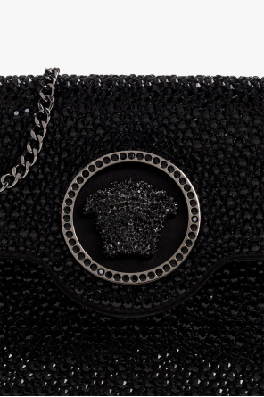 Black shoulder bag from Versace. Made of calf leather, this model is decorated with a Medusa head detail and sparkling inserts. It is complete with a shoulder chain, dark silver-tone metal hardware and one internal compartment with one slip pocket.
