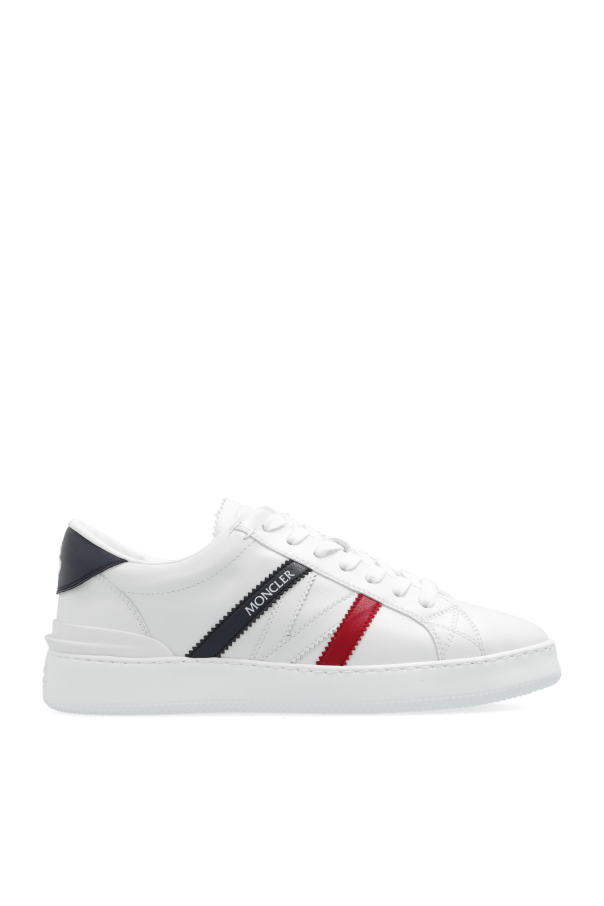 Moncler的白色Monaco运动鞋,系带设计,采用人造皮革制成。饰有标志和红白蓝色贴花。白色橡胶外底。