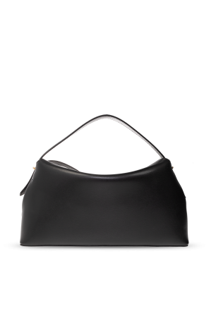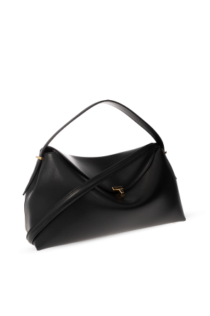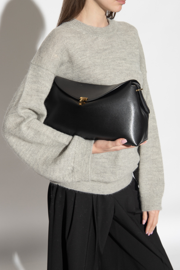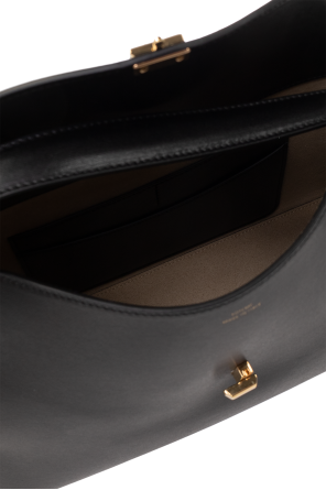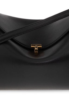 Black shoulder bag from Toteme. Made of leather, this design features a flap with a twist closure, half-round handle, detachable and adjustable shoulder strap, gold-tone metal hardware and one internal compartment with two slip pockets.