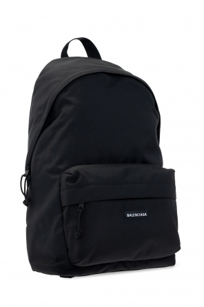 Black ‘Explorer’ backpack from Balenciaga. Emblazoned with a black and white logo patch, this design features a two-way zipper, a zip-up pocket on the front, a half-round top handle, adjustable shoulder straps, black metal hardware and one internal compartment with one slip pocket and one zipped pocket.