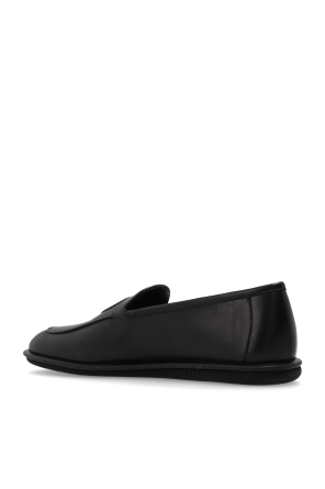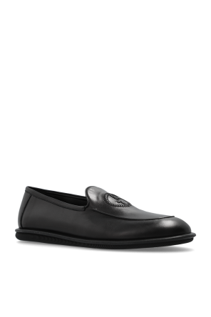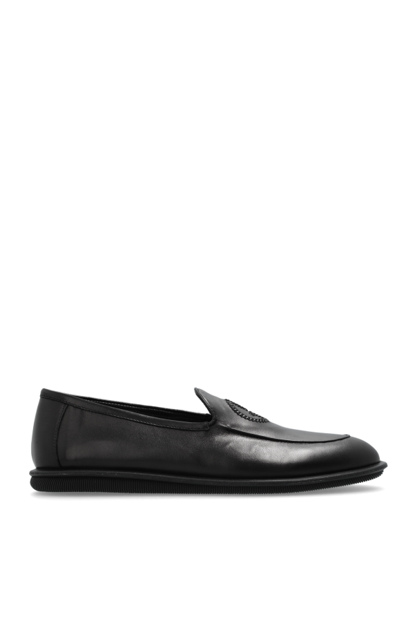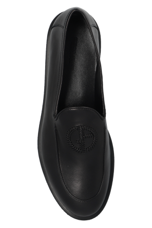 Giorgio Armani的黑色皮质乐福鞋。前面饰有刺绣的字母标志。黑色橡胶鞋底。