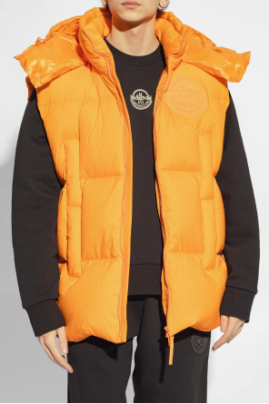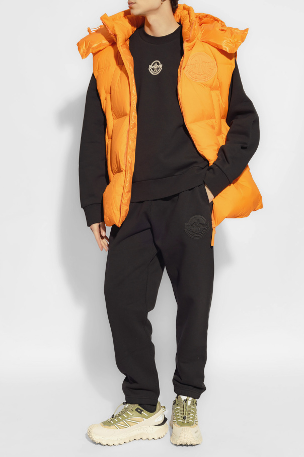 Orange ‘Apus’ quilted down vest from Moncler Genius, the ‘4 Moncler Roc Nation Designed By Jay-Z’ collection. Emblazoned with a logo patch on the front, this style fastens via a two-way zip and features a standing collar with a detachable drawstring hood, four slip pockets and a drawcord-adjustable hem.