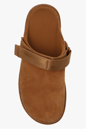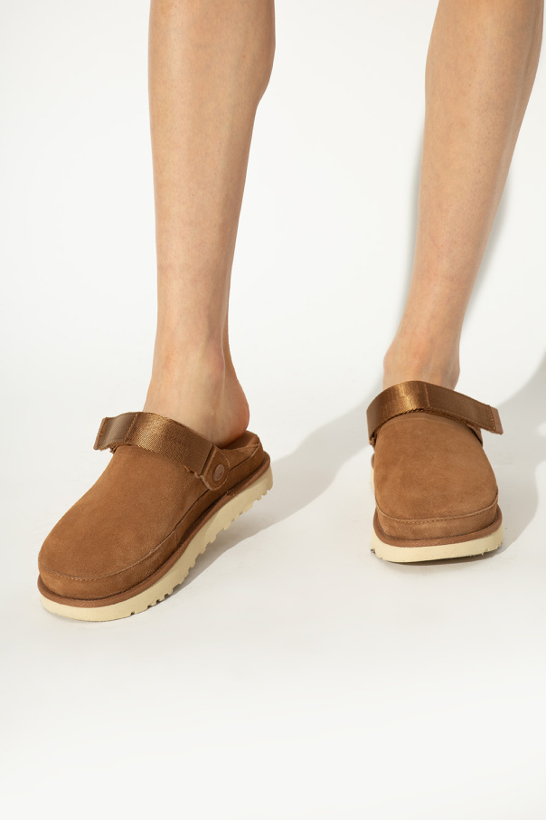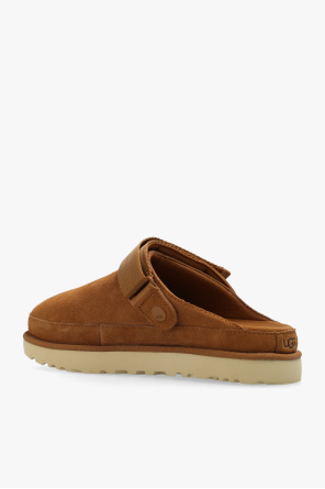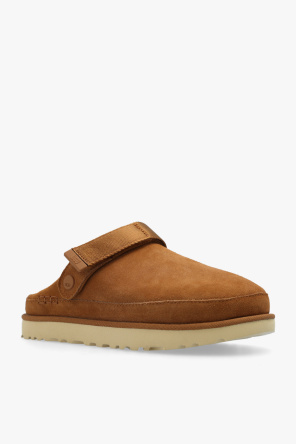 Brown ‘Goldenstar’ slides from UGG. Made of suede, this pair features a velcro strap at the back, embossed logo as well as a cream rubber and EVA SugarSole™.