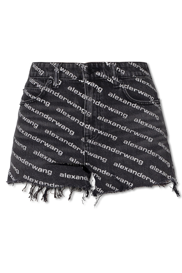 Dark grey denim shorts from Alexander Wang. Made of cotton, this garment features a zip and button closure, printed logo pattern in white, five slip pockets, black and white patch and raw cut edges.