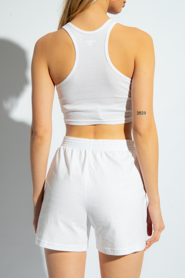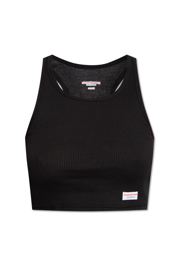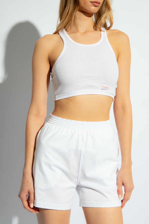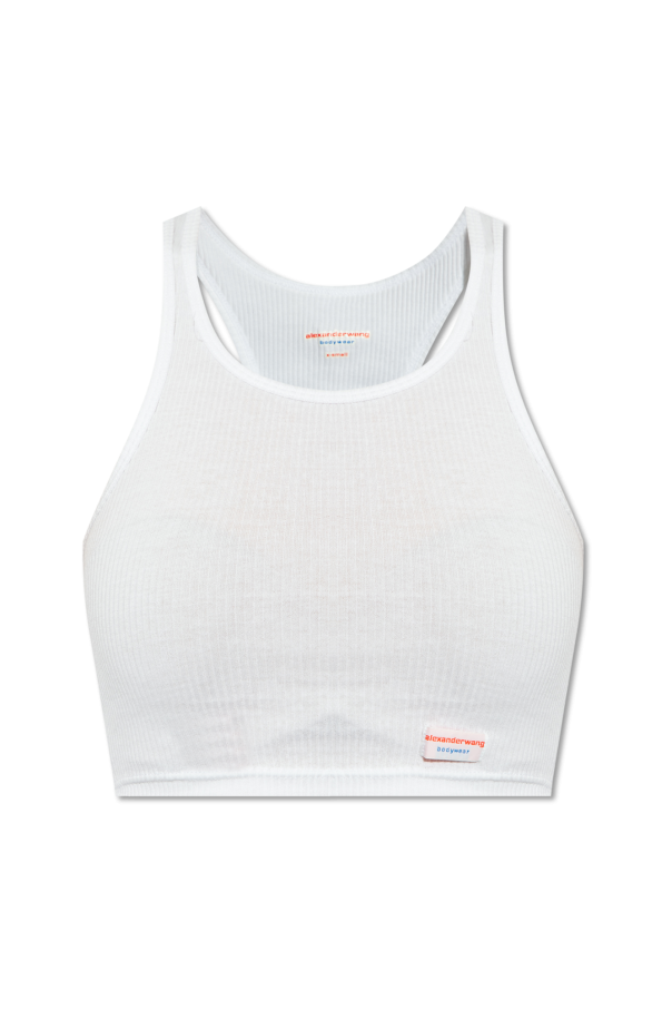 White cropped tank top from Alexander Wang, the ‘Bodywear’ collection. Made of ribbed cotton, this round neck design is decorated with a logo patch.