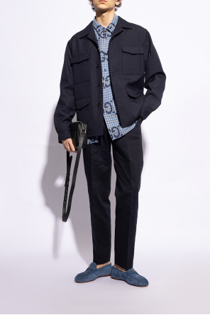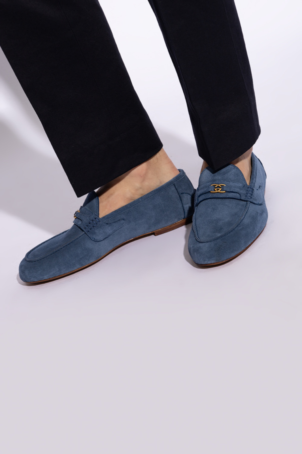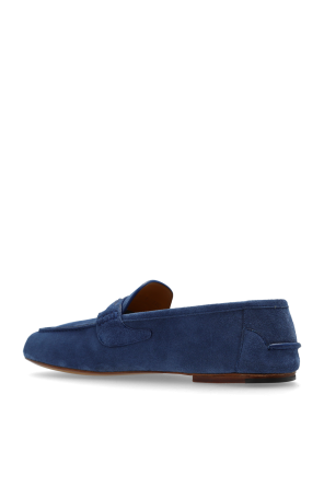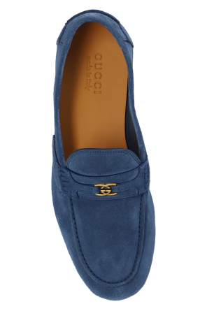 Blue loafers from Gucci. Made from suede, this model sits on a brown leather sole and showcases antiqued gold-tone logo hardware on the front.