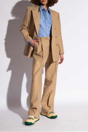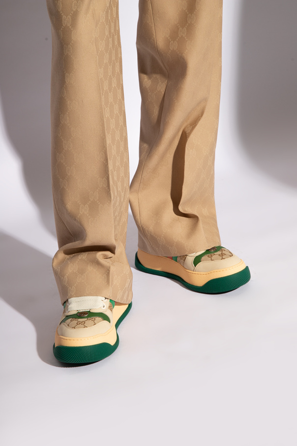 Grey, beige and green ‘Screener Trainer’ platform sneakers from Gucci. Made from smooth leather and fabric, this lace-up model showcases a monogram pattern, the brand's logo, green-red-green ‘Web’ stripe detailing and a green and cream rubber sole.