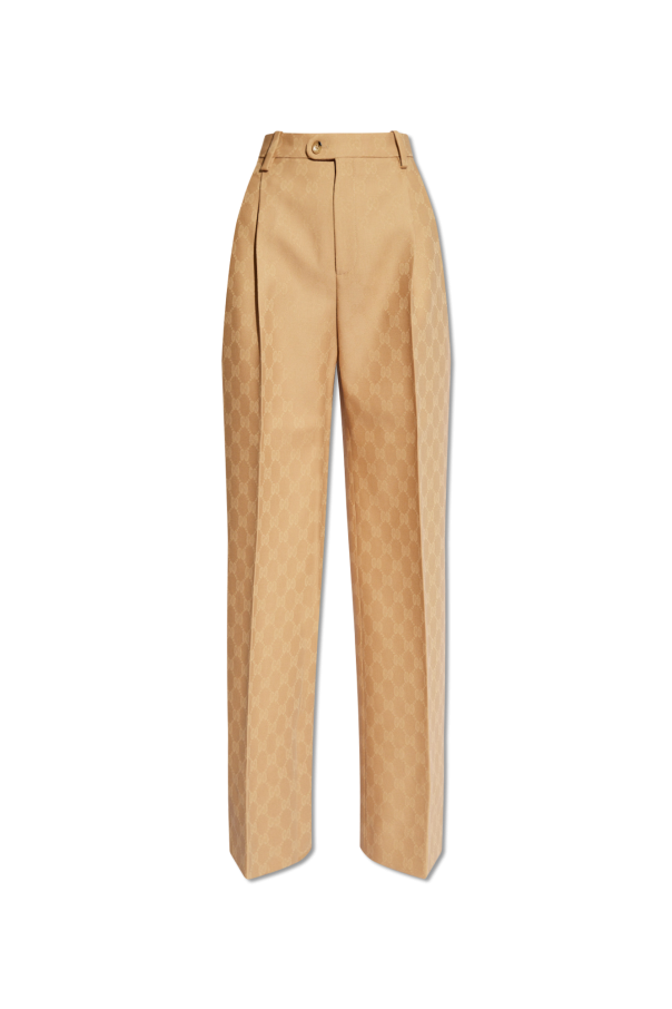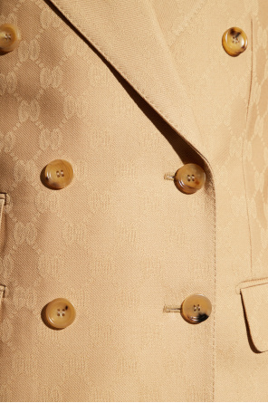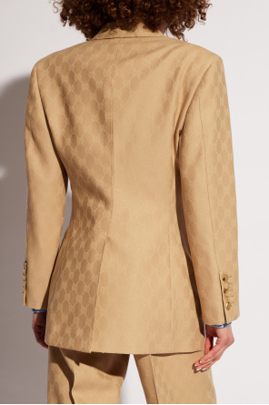 Beige blazer from Gucci. Made from wool with a double-breasted silhouette, this style showcases a ‘GG’ monogram pattern, button fastenings, peak lapels, one welt pocket, three flapped pockets, long sleeves and a single back vent.