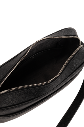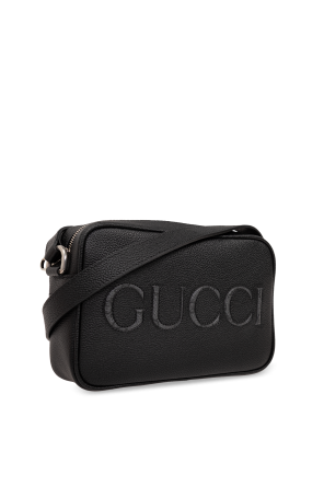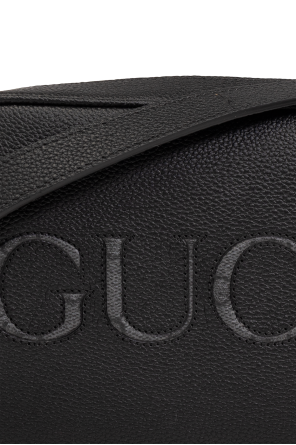 Gucci的黑色迷你单肩包。采用皮革制作。拉链闭合。正面饰有灰色凸起标志。背面设有一个插袋。可调节的单肩带。内部配有一个主隔层和一个按扣口袋。