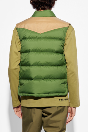 Green and beige ‘Veny’ quilted down jacket from Moncler Grenoble, the ‘Moncler Grenoble Day-Namic’ collection. Fastened with snap buttons, this garment features a logo patch, stand collar and two snap-fastened pockets.
