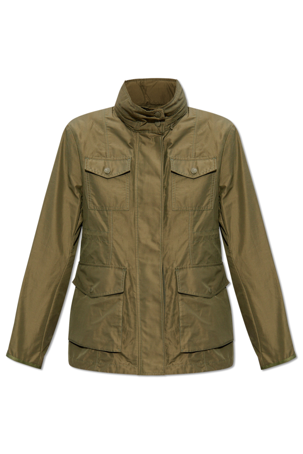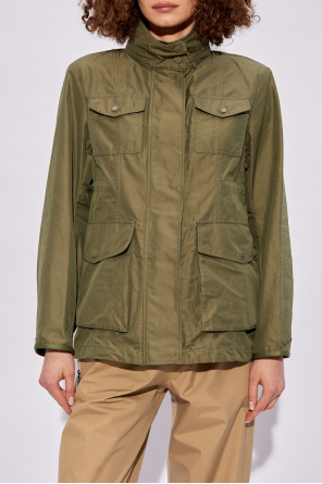Green ‘Ilo’ hooded jacket from Moncler. Made from a cotton blend, this garment features a two-way zip and snap buttons, a drawstring waist, logo patch on the shoulder, stand collar with a concealed hood, four snap-fastened flap pockets and long sleeves.