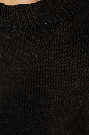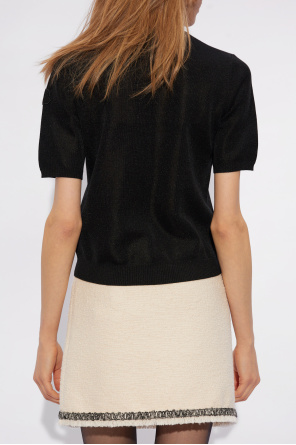 Black sweater from Moncler. Crafted from knit fabric with a shiny finish, this design features a logo patch on the shoulder and ribbed trims at the crew neck, hem and cuffs.
