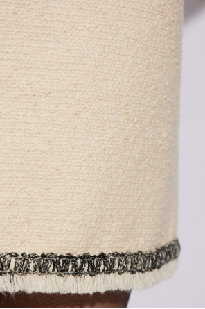Cream tweed skirt from Moncler. Made from cotton, this style fastens via a side zip and hook & eye closure and showcases black and cream stitching details and fringes.