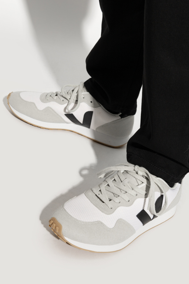 White, light grey and black ‘SDU ALVEOMESH’ sneakers from Veja. Crafted from Alveomesh, a durable material derived in 100% from recycled bottles. Trimmed with vegan suede, this lace-up pair features the label’s signature navy logo patch produced from rubber and rice waste. The organic-sourced and recycled insole consists of wild rubber, sugar cane, Amazon, organic cotton and recycled EVA. The midsole is crafted from sugar cane (53%), while the glued outsole – from Amazon rubber (12%) and rice waste (30%) with a perforated surface for increased traction and cushioning. It is set on a beige and white rubber sole made from organic and recycled materials. The flexible mesh lining crafted from 100% recycled plastic bottles is developed to acquire a better resistance to friction and ensure comfort with every step.