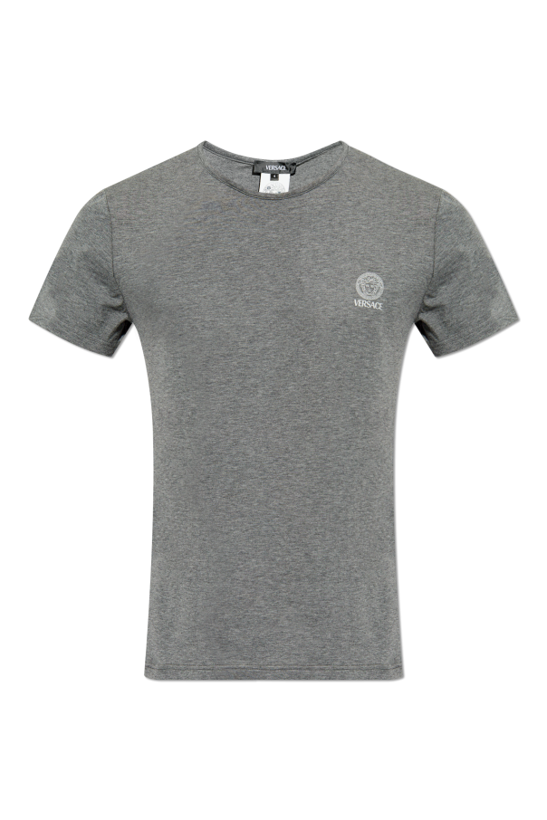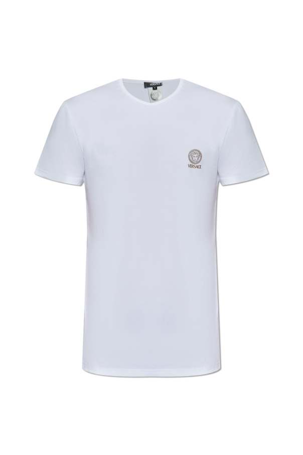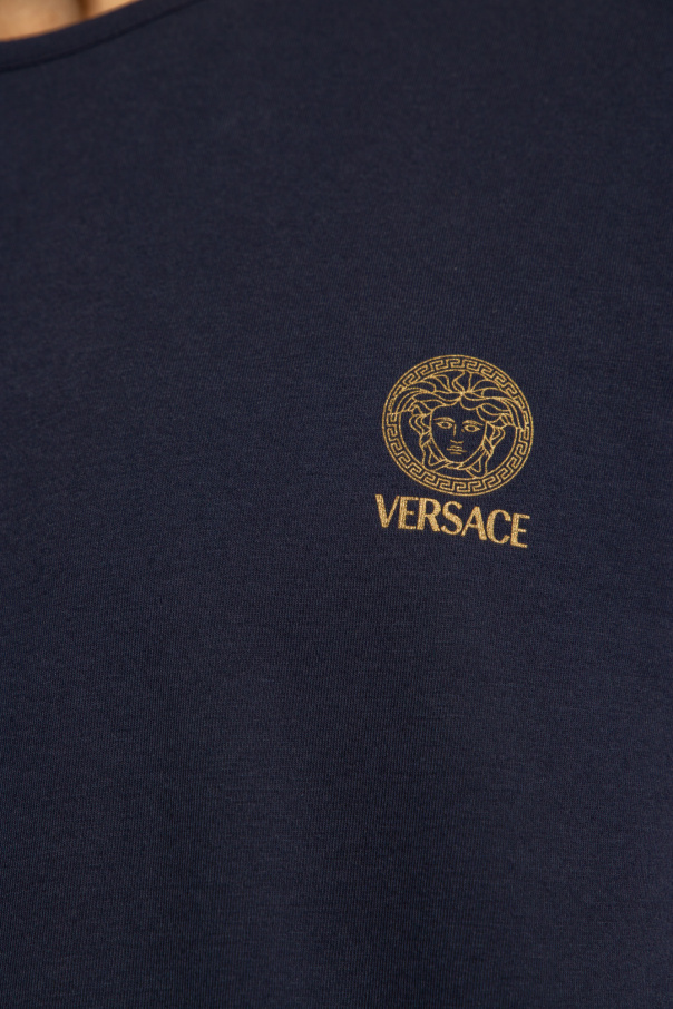 Navy top from Versace, the ‘Underwear’ collection. This garment features a gold-tone logo print and a ribbed crew neck.