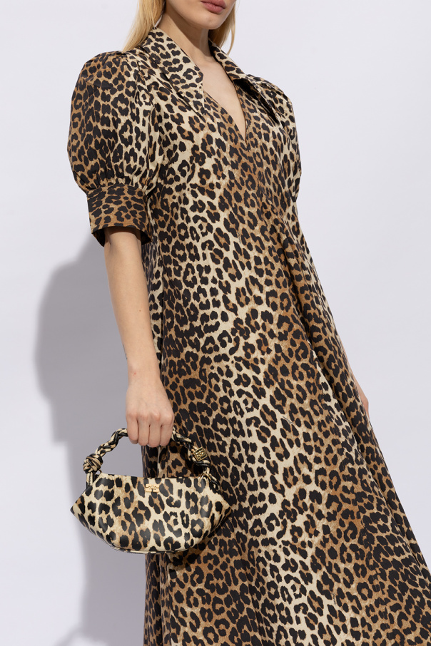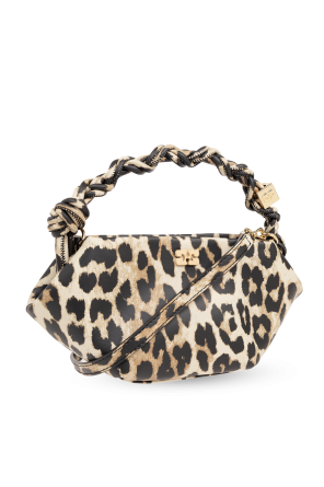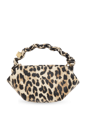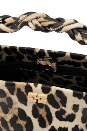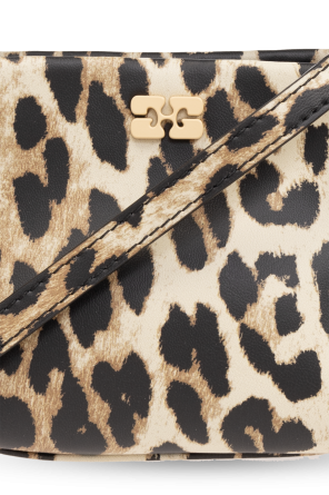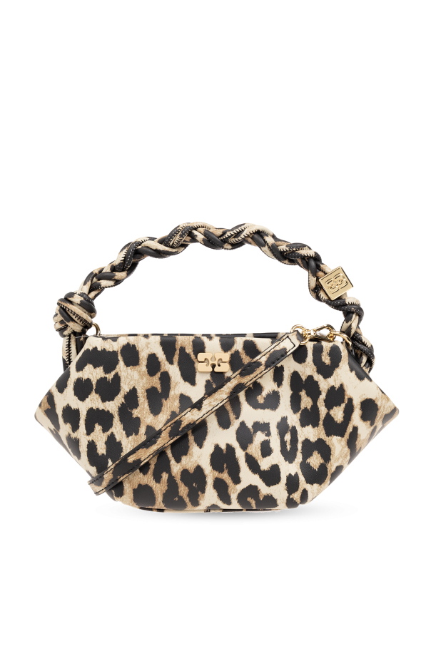 Beige, brown and black ‘Bou Mini’ shoulder bag from Ganni. Made from a recycled leather blend, this design fastens via a snap and showcases an animal motif as well as an application on the front and an embossed logo on the back. It is complete with a detachable and adjustable shoulder strap, gold-tone metal hardware, one braided handle and one internal compartment with a card slot.