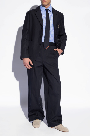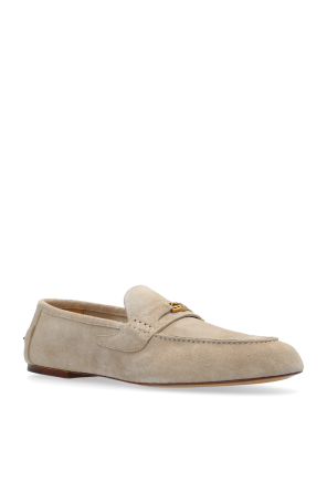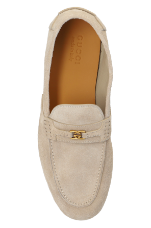 Greyish beige loafers from Gucci. Made of suede, this pair features a strap with a metal logo detail in gold-tone and a brown leather sole.