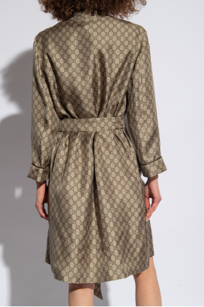 Beige and brown pyjama-style shirt from Gucci. Made of silk, this design features a tied waist belt, monogram pattern, peak lapels, three slip pockets and long sleeves with buttoned cuffs.