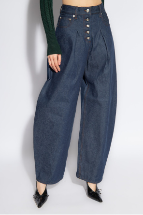 Navy blue balloon jeans from Jacquemus. Falling with wide legs that taper slightly towards the ankles, this pair features button fastenings, classic five-slip pockets and a brown patch with an embossed logo on the back.