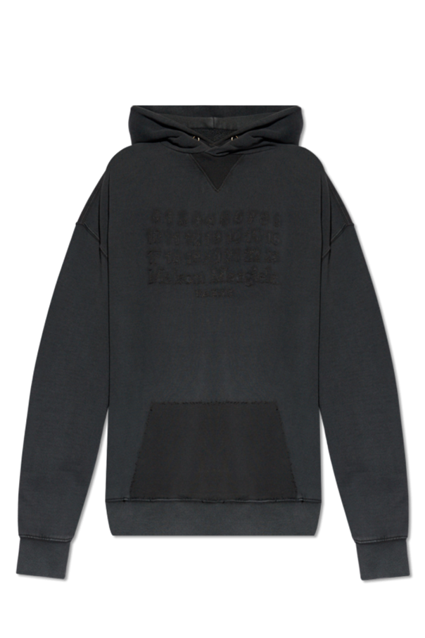 Dark grey hoodie from MM6 Maison Margiela. Made from cotton with a relaxed fit, this style showcases an embroidered logo, distressed effects and ribbed trims on the bottom hem and cuffs.