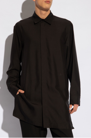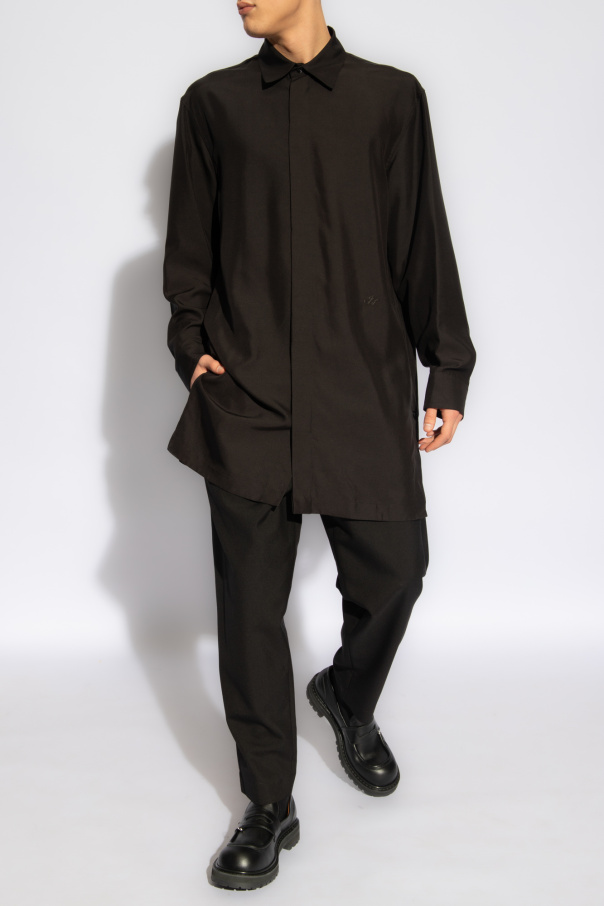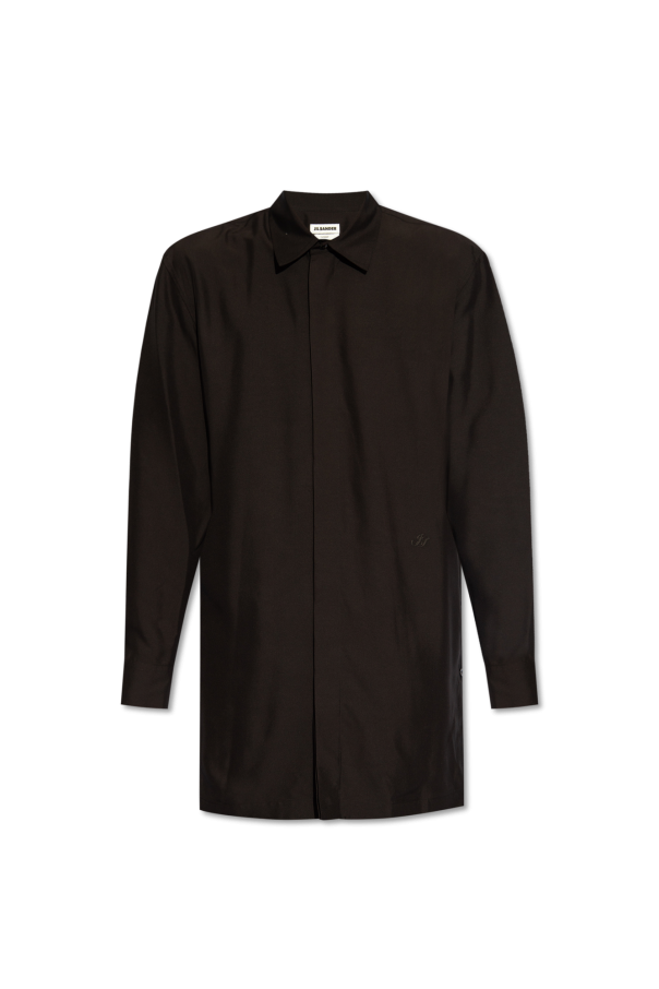 Black ‘Tuesday PM’ shirt from JIL SANDER. Made from silk with a relaxed fit, this style fastens via buttons with a concealed placket and features a classic collar, the brand's logo embroidered on the front, button closures on the sides, and long sleeves with button cuffs.