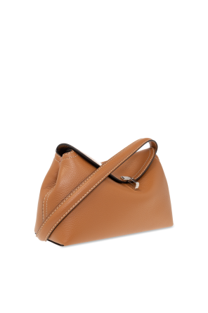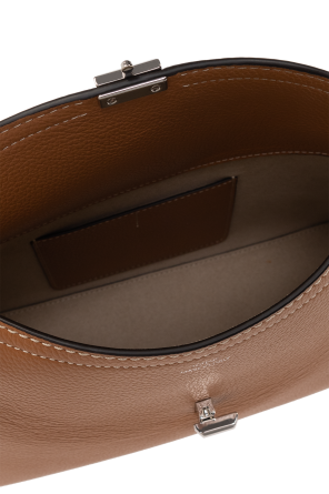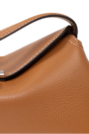 Brown shoulder bag from Toteme. Made of leather, this design features a flap with a twist closure, cream stitches, detachable and adjustable shoulder strap, silver-tone metal hardware and one internal compartment with one card slot.