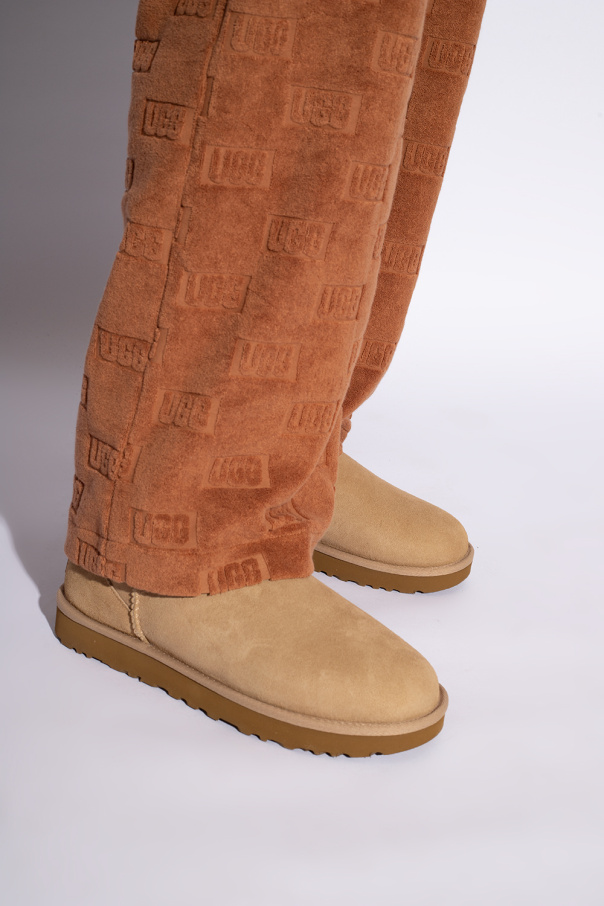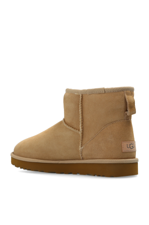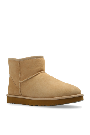 Beige ‘Classic Mini II’ snow boots from UGG. Made of suede insulated with lamb wool, this pair features stitches, a logo patch at the back and brown EVA foam sole.