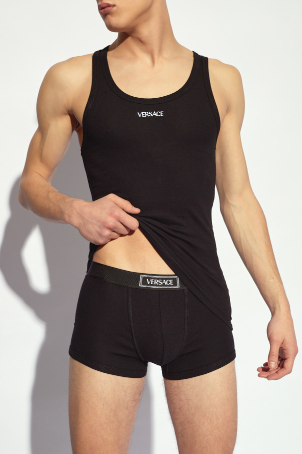 Black ribbed sleeveless T-shirt from Versace, the ‘Underwear’ line. Made of cotton, this crewneck design is decorated with a white logo embroidery.