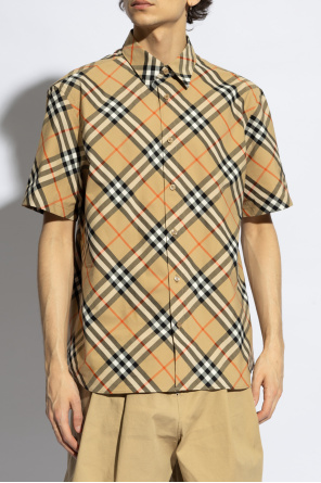 Beige, black and red shirt from Burberry. Made from cotton, this style showcases the brand's signature check motif, button fastenings and short sleeves.