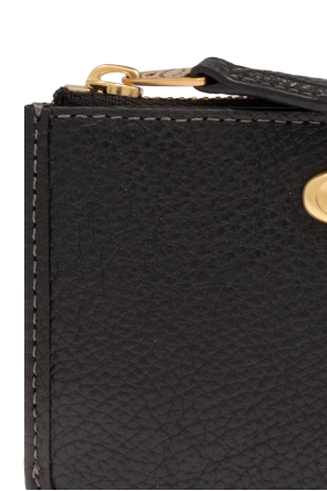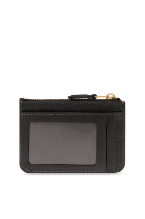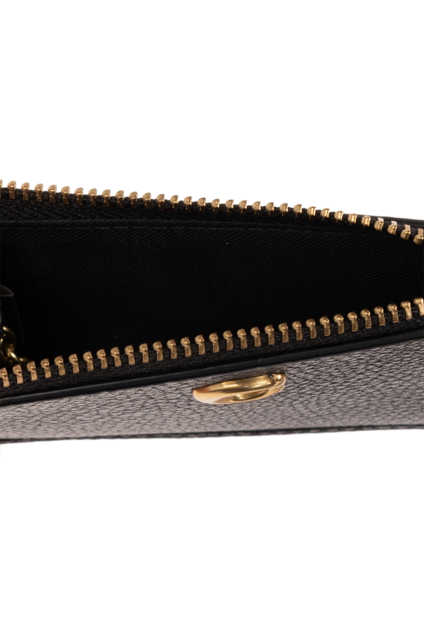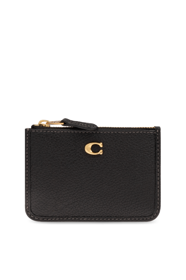 Purple card case from Coach. Made of grained leather, this item showcases a logo-shaped application on the front, one zip pocket with a keyring and chain inside, gold-tone metal hardware and three card slots.