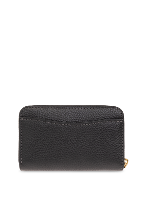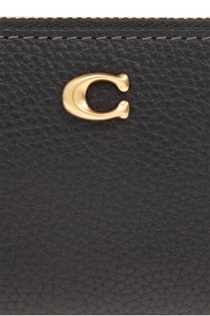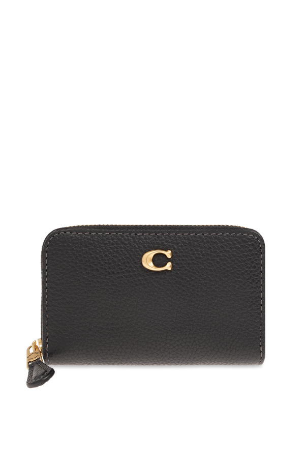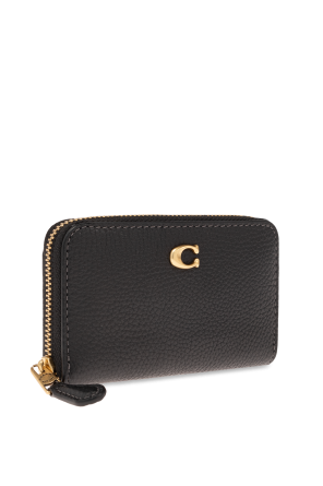 Black card case from Coach. Made of leather, this item fastens via a zip and showcases a logo-shaped application on the front, one card slot on the back, gold-tone metal hardware as well as an interior with three pockets and two card slots.