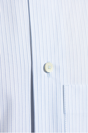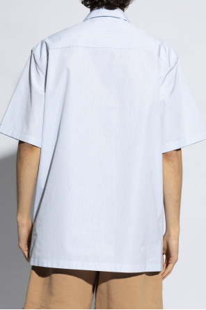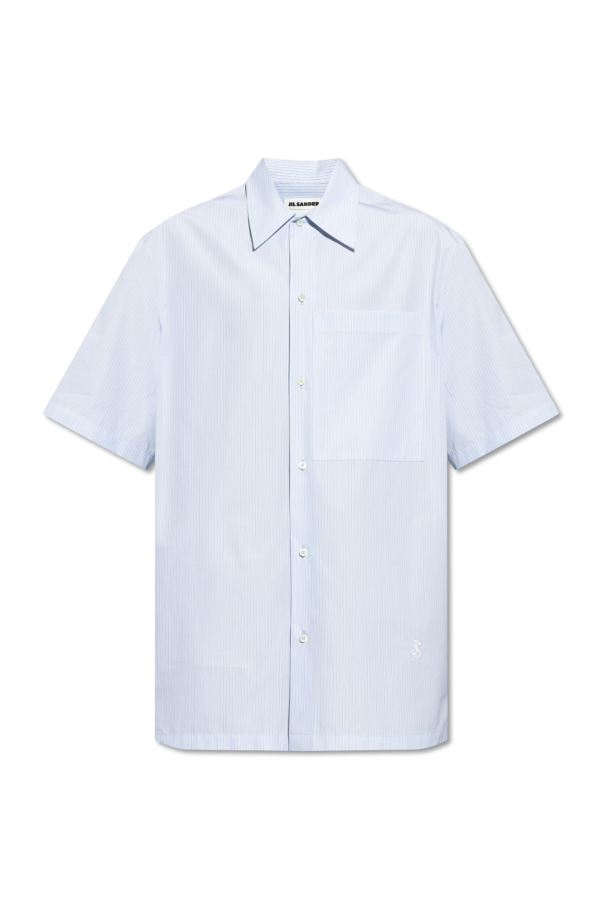 Blue and white shirt from Jil Sander. Made from cotton, this style showcases a stripe pattern, button fastenings, short sleeves and a slip chest pocket accompanied by an embroidered logo.
