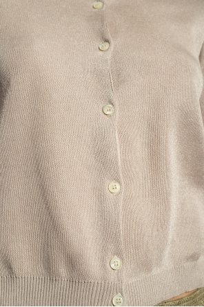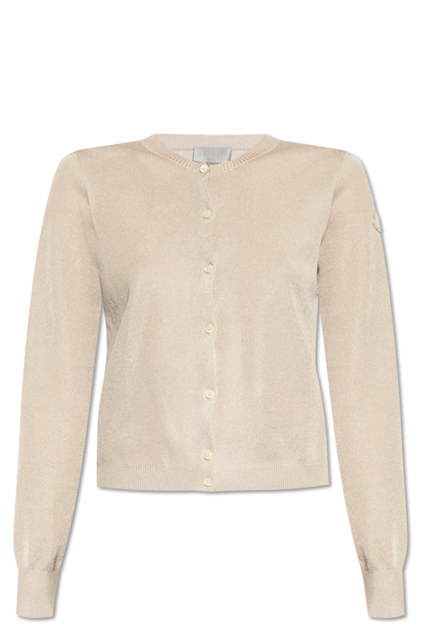 Light beige and grey cardigan from Moncler. Crafted with a glossy finish, this style features a round neck, button fastenings, ribbed trims on the bottom hem and cuffs and long sleeves – one has a logo patch.
