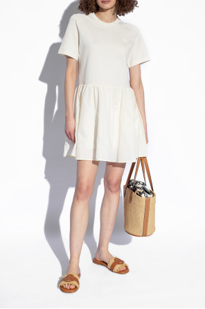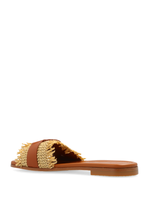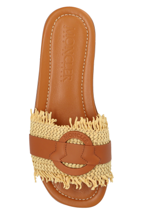 Brown and light beige ‘Bell’ slides from Moncler. Made of smooth leather, this model sits on a beige leather sole with rubber trim and showcases a logo-shaped application and braided rope detailing.