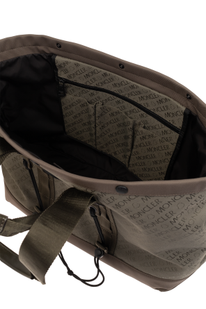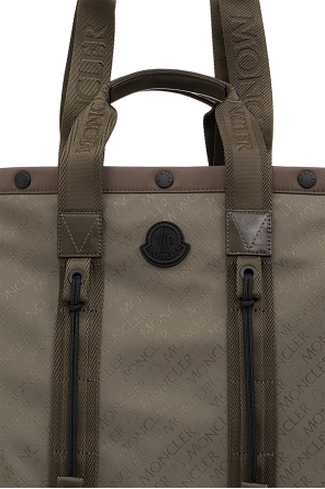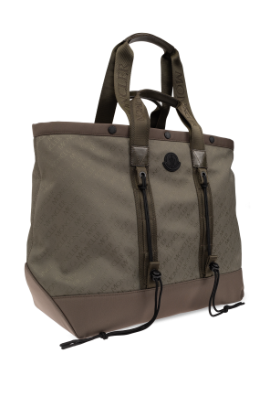 Green shopper bag from Moncler. Made from monogrammed material and trimmed with leather, this design fastens via snaps and showcases a rubber logo patch and black drawstrings on the front, two half-round handles and straps and one internal compartment with one zip pocket and three slip pockets.