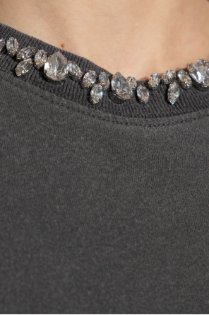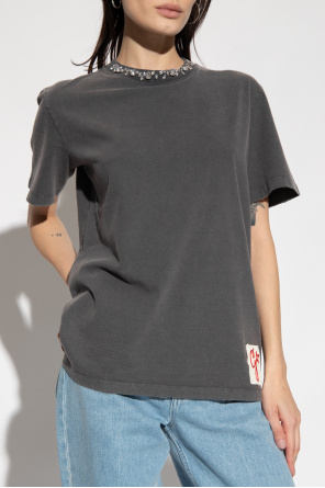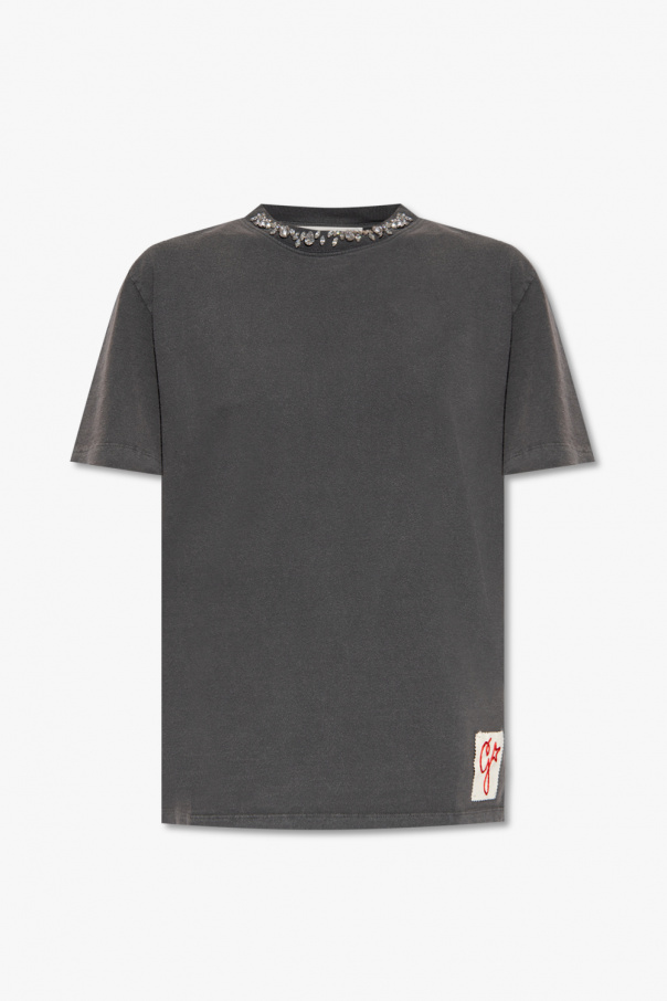 Golden Goose的深灰色棉质T恤,复古效果。 背面饰有标志性的金属星星贴花,正面饰有红色字母刺绣拼贴,罗纹圆领饰有凸圆形水晶和短袖。