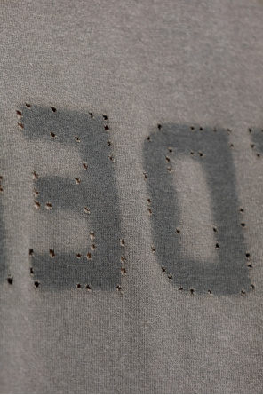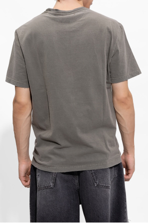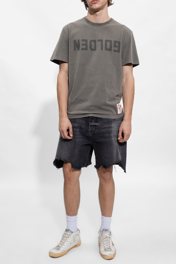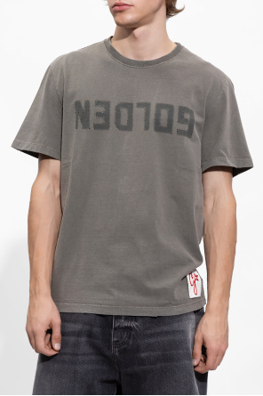 Golden Goose 复古效果灰绿色T恤,采用棉质制成,饰以徽标、红色字母刺绣的品牌标志性贴片、背面标志性的金属星星贴花、罗纹圆领和短袖。
