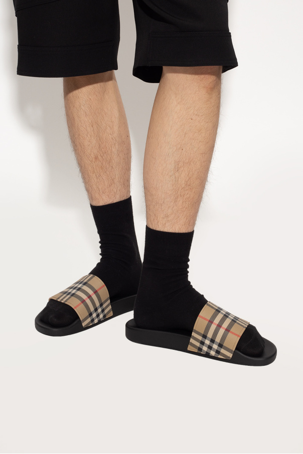 Burberry 米色'Furley'拖鞋,采用热塑性聚氨酯制成,饰有标志性的多色格纹图案,黑色橡胶鞋底带有徽标。