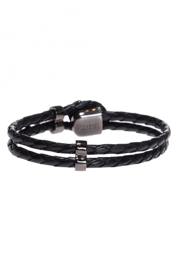 Versace的黑色编织手镯。皮革质。附勾扣。附银色调黄铜质Medusa头饰。