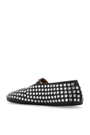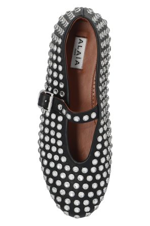 Black ballet flats from Alaia. Made from lamb leather, this model sits on a black rubber sole flaunting the brand's signature pattern and showcases an adjustable buckle strap and crystal-bejewelled metal applications all over.