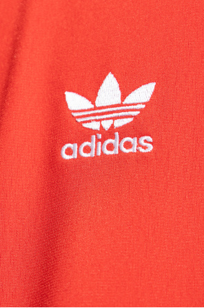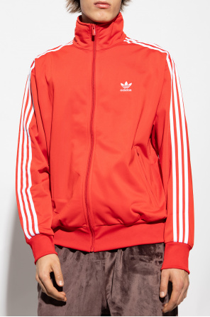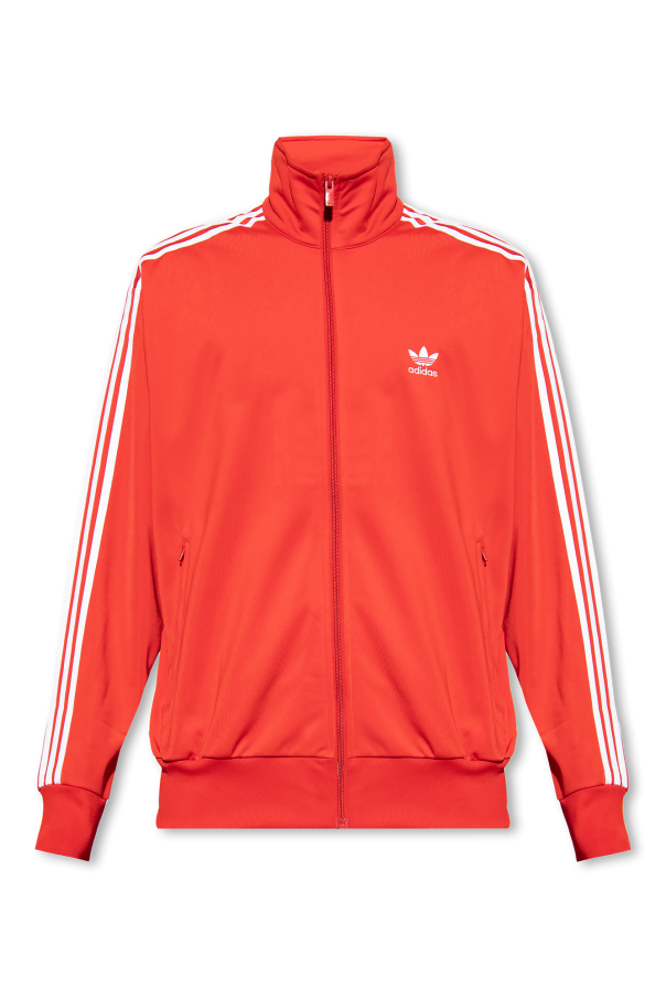 ADIDAS Originals的红色运动衫,采用再生面料制成,拉链开合,绣有白色徽标,品牌标志性三条纹,正面有两个拉链口袋,长袖配有罗纹饰边。