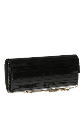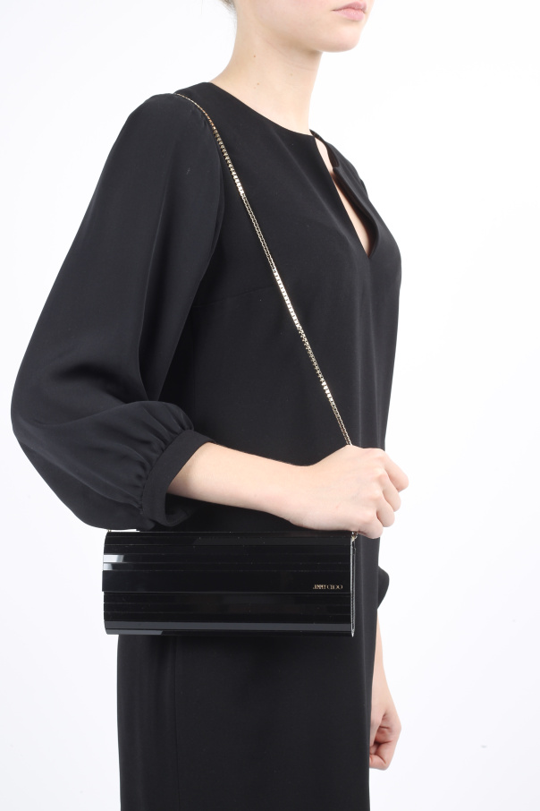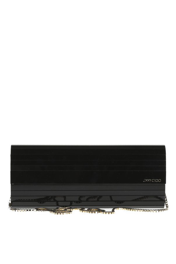 这款黑色Sweetie亚克力长手拿包来自Jimmy Choo,配有按扣开合与链式长肩带。正面饰以标识。内有一个侧袋。