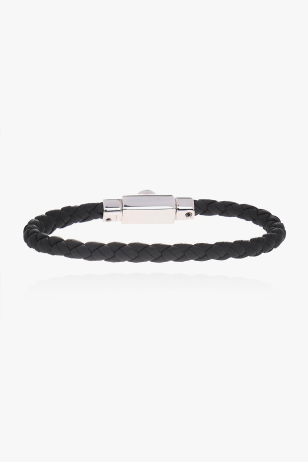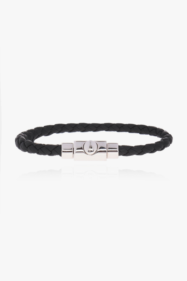 Salvatore Ferragamo的黑色编织手镯。牛皮革制成。饰有含银色logo的装饰扣。